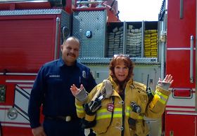 Pictured here with California Fireman Fernandez, SaLee' wears a 45 pound firefighter jacket (pictured above) and is introduced to the 150 pounds of equipment and fire-proof gear that firefighters have to carry up flights of stairs, ascending at one flight per minute.